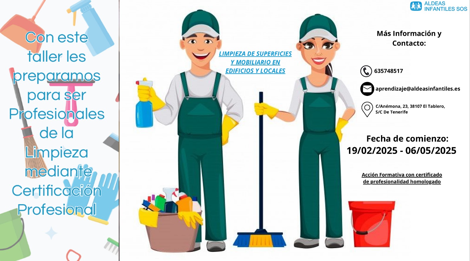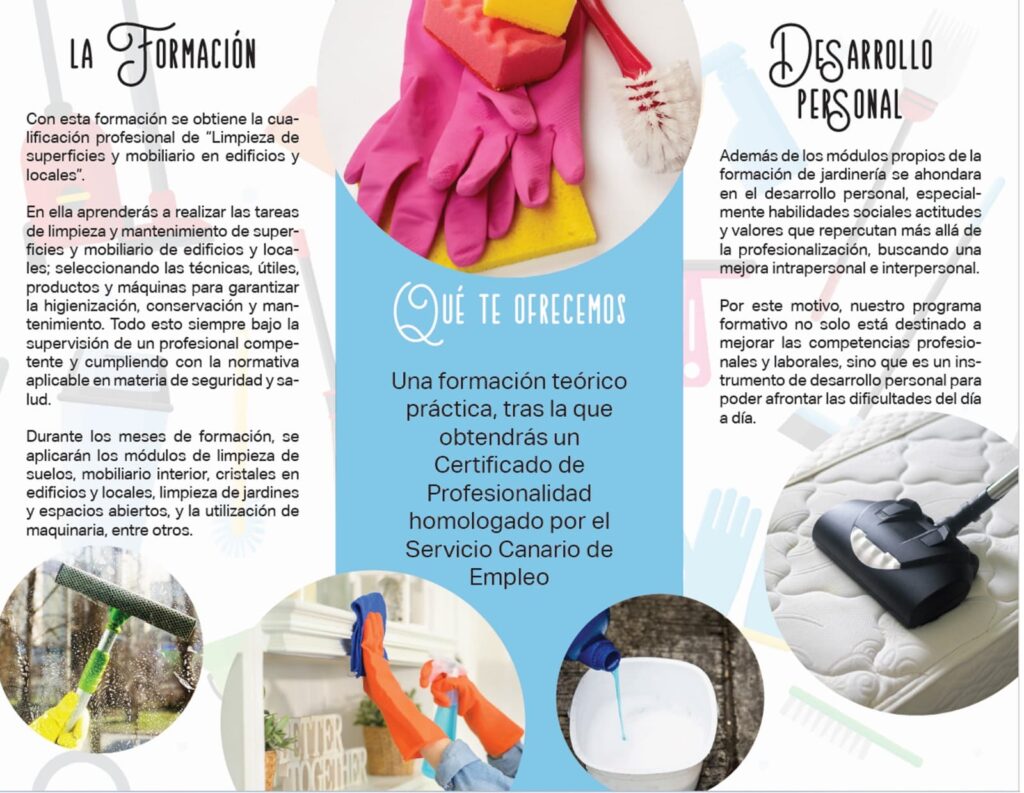 El curso tiene una duración de tres meses e incluye módulos específicos sobre la limpieza de suelos, mobiliario interior, cristales y espacios abiertos, además del uso adecuado de maquinaria especializada.
